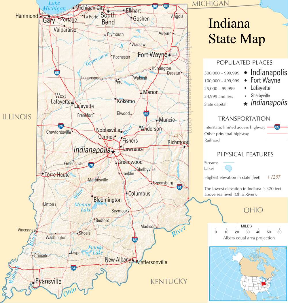 The electronic map of Indiana State that is located below is provided by Google Maps. You can "grab" the Indiana State map and move it around to re-centre the map. You can change between standard map view and satellite map view by clicking the small square on the bottom left hand corner of the map. Satellite map view