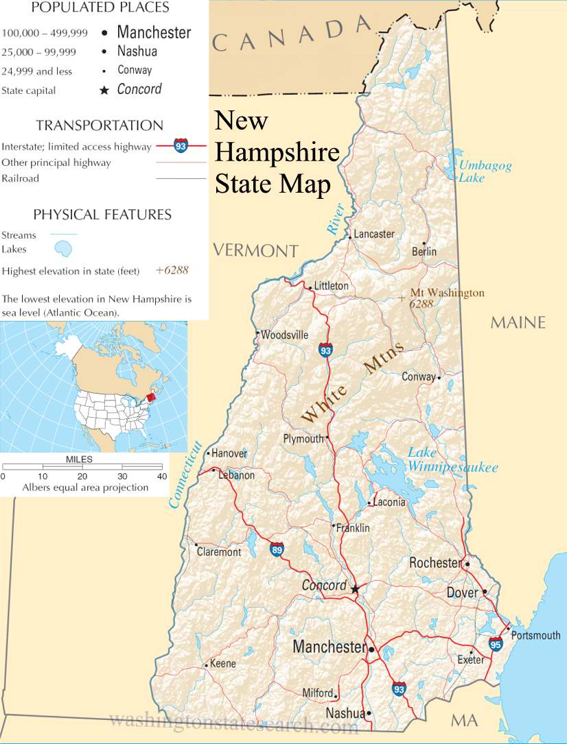 The electronic map of New Hampshire State that is located below is provided by Google Maps. You can "grab" the New Hampshire State map and move it around to re-centre the map. You can change between standard map view and satellite map view by clicking the small square on the bottom left hand corner of the map. Satellite map view utilizes orbiting satellite or aerial high resolution photography to display images of the map location to street level detail (really quite amazing). Standard map view shows a traditional street map (also known as a road map). You can use the zoom buttons on the bottom right hand side of the map to zoom in or out to street level detail. We have maps for most towns and cities in the US, so click on the United States Maps link to see more American online maps.