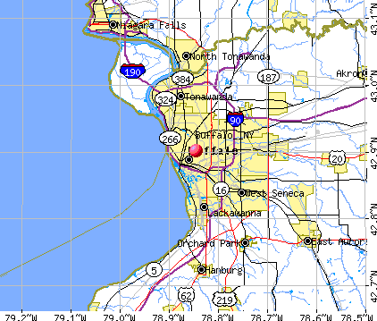 Welcome to our Buffalo New York street map page. The street map of Buffalo NY that is located below is provided by Google Maps. You can "grab" the Buffalo New York street map and move it around to re-centre the map. You can change between standard map view and satellite map view by clicking the small square on the bottom left hand corner of the map. Satellite map view utilizes orbiting satellite or aerial high resolution photography to display images of the map location to street level detail (really quite amazing). Standard map view shows a traditional street map (also known as a road map). You can use the zoom buttons on the bottom right hand side of the map to zoom in or out to street level detail. We have maps for most towns and cities in the US, so click on the United States Maps link to see more American online maps.