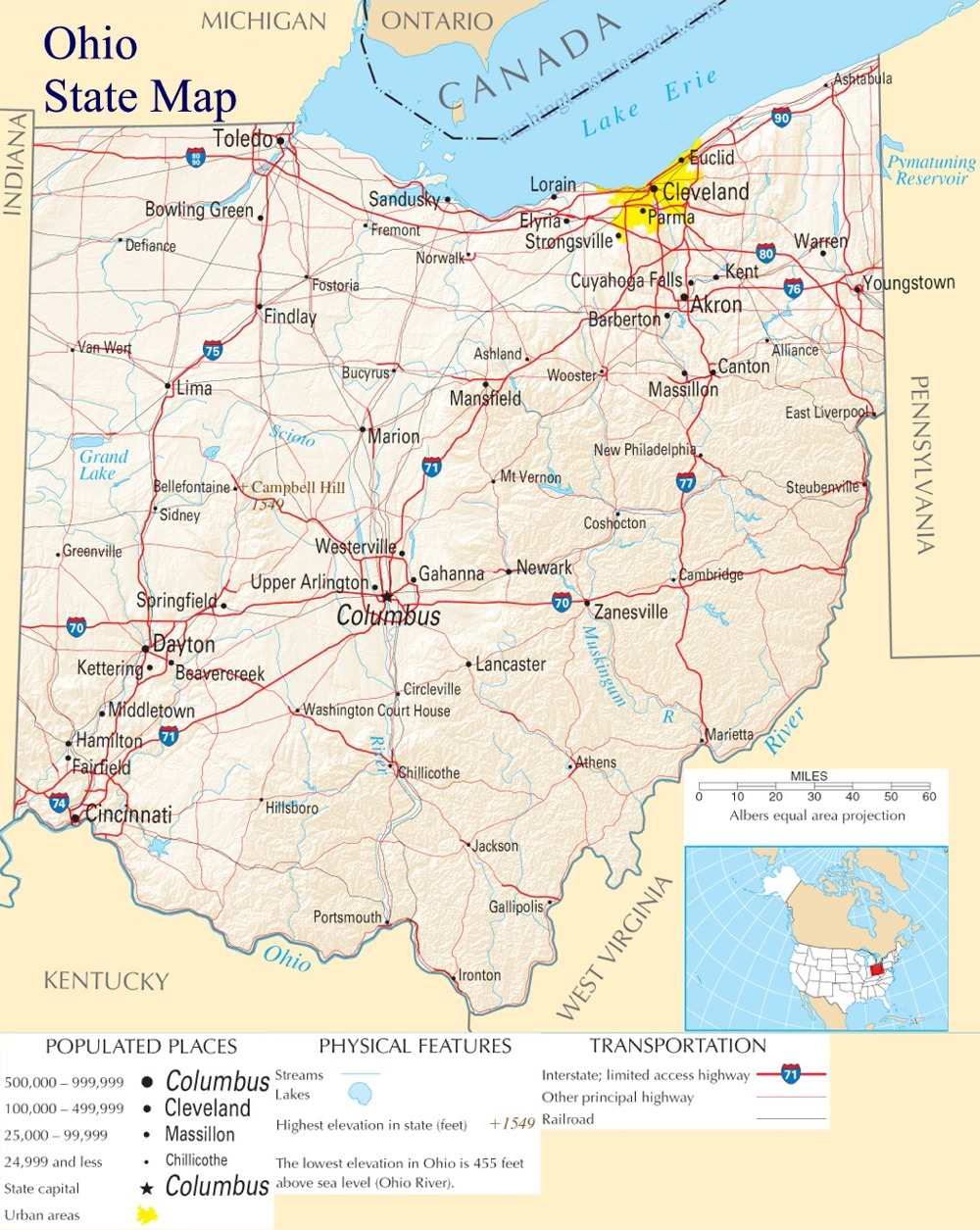 The electronic map of Ohio State that is located below is provided by Google Maps. You can "grab" the Ohio State map and move it around to re-centre the map. You can change between standard map view and satellite map view by clicking the small square on the bottom left hand corner of the map. Satellite map view utilizes orbiting satellite or aerial high resolution photography to display images of the map location to street level detail (really quite amazing). Standard map view shows a traditional street map (also known as a road map). You can use the zoom buttons on the bottom right hand side of the map to zoom in or out to street level detail. We have maps for most towns and cities in the US, so click on the United States Maps link to see more American online maps.