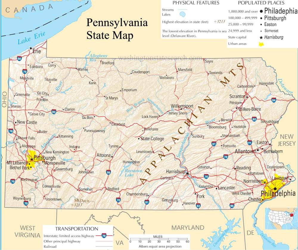 The electronic map of Pennsylvania State that is located below is provided by Google Maps. You can "grab" the Pennsylvania State map and move it around to re-centre the map. You can change between standard map view and satellite map view by clicking the small square on the bottom left hand corner of the map. Satellite map view utilizes orbiting satellite or aerial high resolution photography to display images of the map location to street level detail (really quite amazing). Standard map view shows a traditional street map (also known as a road map). You can use the zoom buttons on the bottom right hand side of the map to zoom in or out to street level detail. We have maps for most towns and cities in the US, so click on the United States Maps link to see more American online maps.