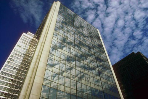 Welcome to our New York City Photo Gallery. This is a photograph from New York City. It shows an impressive high rise building with the sky reflected in its glass facade.