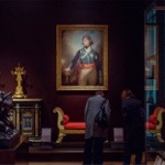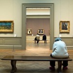 People sitting in one of the European painting galleries. Claude Monet, Edgar Degas, Édouard Manet, Goya, Paul Cézanne, Rembrandt, Vincent van Gogh, etc.
