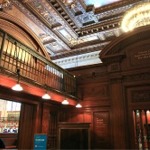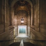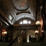 The vault ceiling and luminere at the bottom of the staircase that leads up to the McGraw Rotunda in the New York Public Library Main Branch.