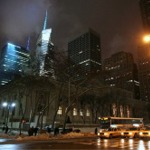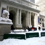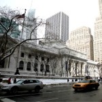 The New York Public Library main branch facade along Fifth Avenue at its intersection with East 41st Street during day time in winter.