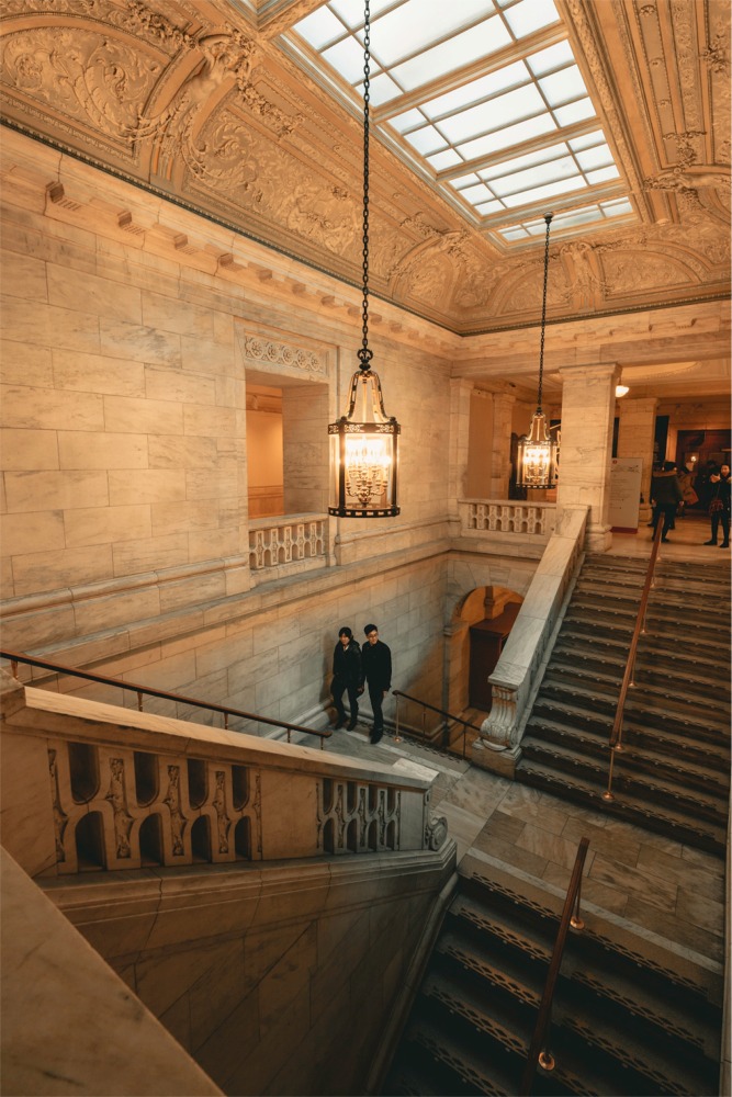 Stair crossways in the New York Public Library main branch along Fifth Avenue between 40th and 42nd Streets. The image also shows the elaborate Beaux-Arts features used in the library's design and construction.