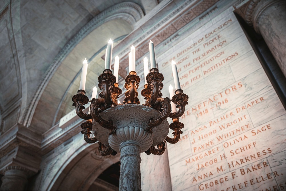 New York Public Library main branch candelabra luminaire in the Astor Hall. In simple terms, an elaborate light fitting. The image also shows the elaborate Beaux-Arts features used in the library's design and construction.