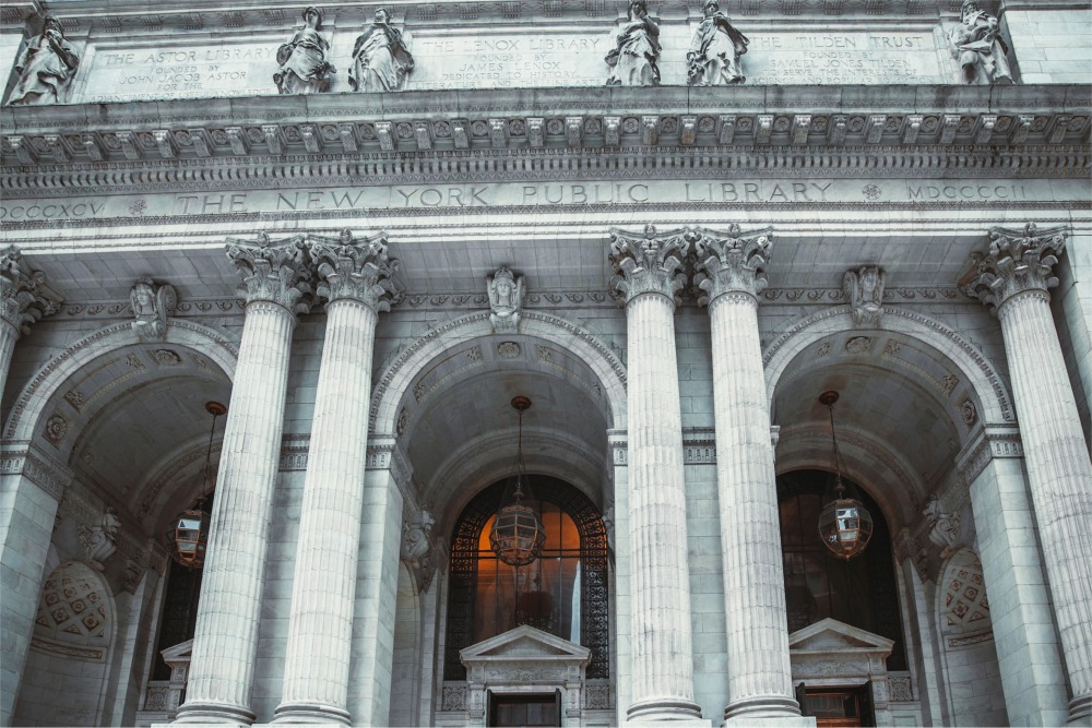 The New York Public Library main branch facade (close up in detail) along Fifth Avenue between 40th and 42nd Streets. The image also shows the elaborate Beaux-Arts features used in the library's design and construction.