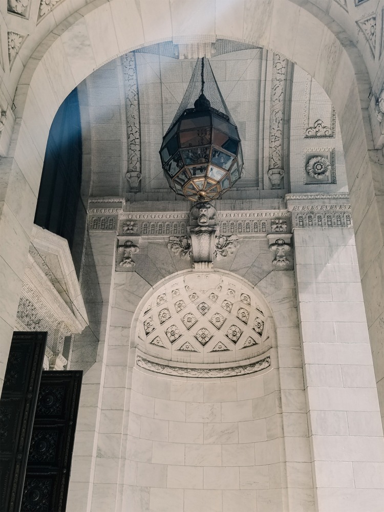 New York Public Library main branch exterior luminaire at the Fifth Avenue main public entrance. The image also shows the elaborate Beaux-Arts features used in the library's design and construction.