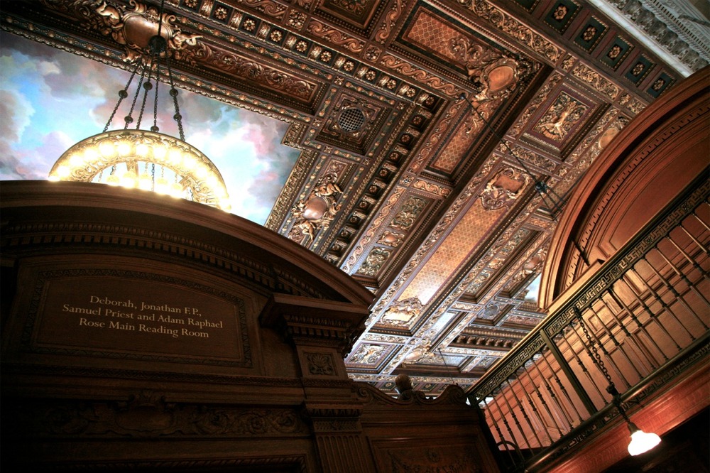 The Rose Main Reading Room foyer in the New York Public Library in all of its resplendent glory — attractive and impressive through being richly colorful or sumptuous.