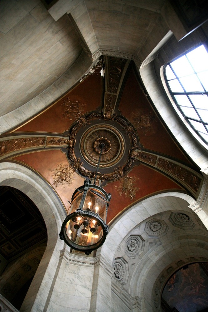 The vault ceiling and luminere at the bottom of the staircase that leads up to the McGraw Rotunda in the New York Public Library Main Branch. The image also shows the elaborate Beaux-Arts features used in the library's design and construction.