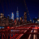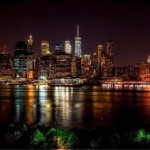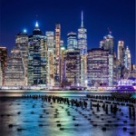 The night sky hangs over the Lower Manhattan skyline like a canopy of stars, a blanket of luminous iridescence that illuminates the Brooklyn Bridge Park and its iconic piles.