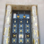 The majestic entrance of the Brooklyn Public Library Central Branch is a stunning sight to behold. The grand columns reach for the sky, decorated with gilded relief carvings.