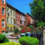This photograph of terraced homes in Brooklyn is a kaleidoscope of dazzling hues. The sun blazes fiercely, its rays piercing through the cloudless sky.