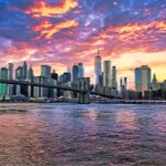 The sun's light streamed down, illuminating the landscape and painting everything in its path in vibrant hues of orange, pink, and lavender, and creating a dazzling backdrop for the iconic Brooklyn Bridge.