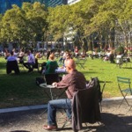 The Bryant Park lawn was washed in the afternoon sunlight, casting a golden hue on the people scattered throughout the park. Tables and chairs had been scattered around the lawn.