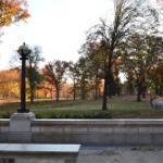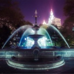 The Jacob Wrey Mould fountain stood at the southern end of the park, its cruciform top silhouetted against the night sky and framed by the park lamps in the background.
