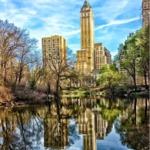 The Pierre, A Taj Hotel, was aglow in the sunlight reflecting off the Central Park Pond. The azure sky was crisscrossed with thin wispy clouds, while trees lined the banks of the pond's edge.