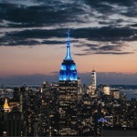 The Empire State Building, its upper steps brilliantly illuminated in blue, stood majestically in the foreground, its steeple piercing the sky in a heroic salute.