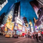 The sky above Times Square shimmered with a brilliant, almost celestial radiance. All around, the bright neon billboards and captivating marquees illuminated the bustling urban scene.