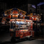 The air was still and the night was thick as the Sabrett Hot Dog vendor worked diligently, his bright lights providing a beacon in the darkness. He hummed softly to himself as he went about his work.