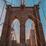 The pedestrians shuffled off the ferry and made their way to the West pier of the Brooklyn Bridge. The sky was a mottled mix of white and blue, the setting sun illuminating the area in a warm, golden glow.