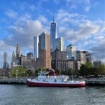 The Alfred E. Smith, a former FDNY fireboat, bobs in the Hudson River below the grand vista of Tribeca, Battery Park City and the iconic skyscrapers of lower Manhattan.