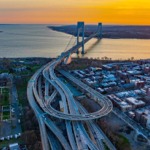 The Verrazano Narrows Bridge basked in the golden orange light of the setting sun, its long span stretching like a bridge of polished gold.