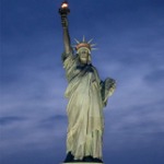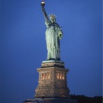 The face of Lady Liberty was cast in the soft blue hue of the evening sky, the white halo of her regal crown amplified by the spotlights on the island below.