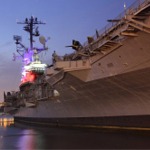 The USS Intrepid Aircraft Carrier looms on the serene Hudson River, its tower brilliantly illuminated with stripes of red, white and purple.