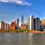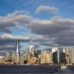 The sun was shining brightly over lower Manhattan, and a glorious azure sky with a wonderful cloud belt on the horizon completed the scene. The Battery Park area was in the foreground, and the One World Trade Center rose up behind it.